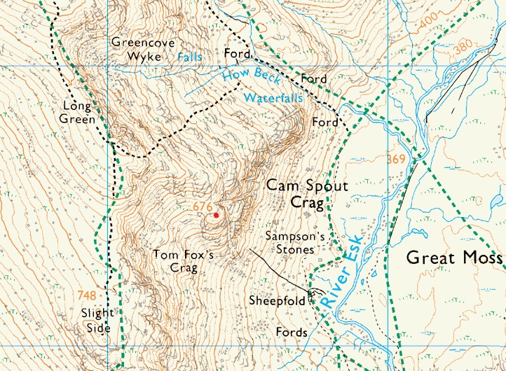 Jubilee Bridge - Hard Knott Pass - Hardknott Roman Fort - Border End - Hard Knott - Yew Bank - Lingcove Beck - Great Moss - River Esk - Cam Spout - How Beck - Cam Spout North Ridge - Cam Spout Crag - Long Green - Slight Side - Traverse Below Horn Crag - High Scarth Crag - Scale Bridge - Taw House - Brotherilkeld - Jubilee Bridge |