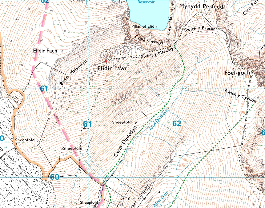 Access Road Marchlyn Mawr Reservoir - Marchlyn Mawr Reservoir - Elidir Fawr North Ridge - Elidir Fawr - Bwlch y Marchlyn - Bwlch y Brecan - Foel-goch - Bwlch 7 Brecan - Mynydd Peredd - Carnedd y Filiast - Marchlyn Mawr Reservoir - Access Road Marchlyn Mawr Reservoir |