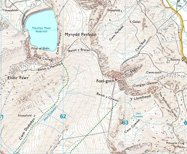 Access Road Marchlyn Mawr Reservoir - Marchlyn Mawr Reservoir - Elidir Fawr North Ridge - Elidir Fawr - Bwlch y Marchlyn - Bwlch y Brecan - Foel-goch - Bwlch 7 Brecan - Mynydd Peredd - Carnedd y Filiast - Marchlyn Mawr Reservoir - Access Road Marchlyn Mawr Reservoir |