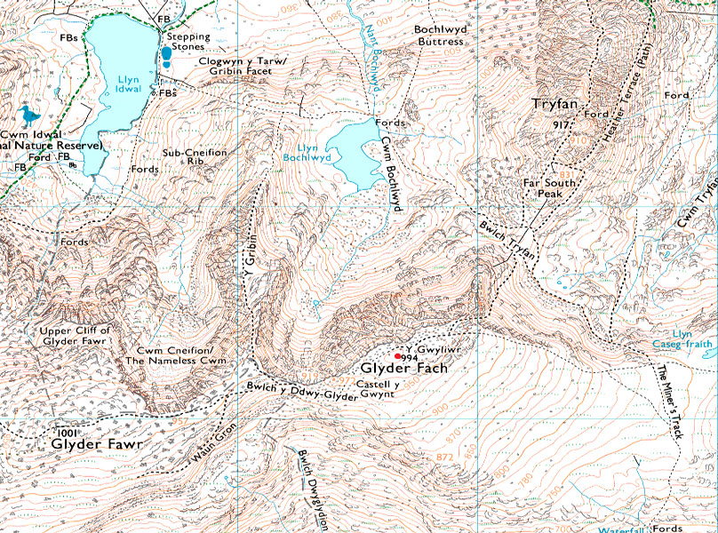Ogwen Tourist Centre - Nant Idwal - Nant Bochlwyd - Llyn Bochlwyd - Y Gribin - Cneifion ArĂȘte - Bwlch y Ddwy Glyder - Glyder Fawr - Bwlch y Ddwy Glyder - Castell y Gwynt - Glyder Fach - Y Gwyliwr - Bristly Scree Path - Bwlch Tryfan - Llyn Bochlwyd - Nant Bochlwyd - Nant Idwal - Ogwen Tourist Centre |