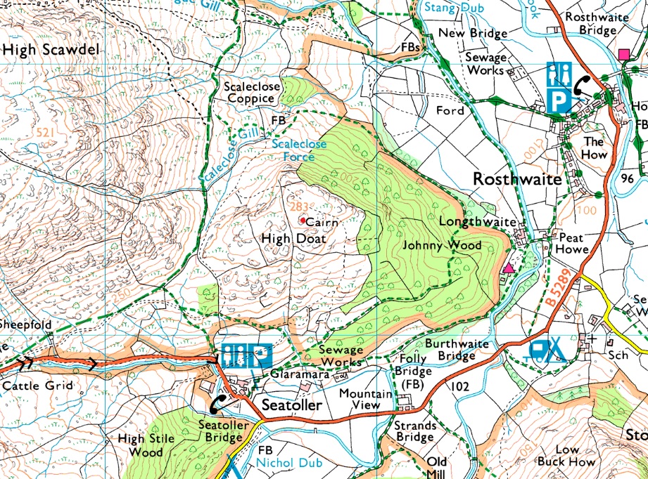 Grange - Holmcrag Wood - Low Hows Wood - High Hows Wood - River Derwent - Longthwaite - Seatoller - High Dote - Tongue Gill - Castle Crag - Broadslack Gill - Grange |