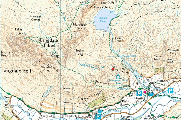 Rossett Bridge - Stickle Barn - Stickle Ghyll - Stickle Tarn - Jack's Rake - Pavey Ark - Harrison Combe - Pike O'Stickle - Loft Crag - Pike Howe - New Dungeon Ghyll - Rossett Bridge |