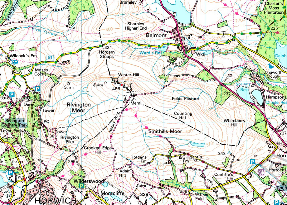 Wilderswood - Rotary Way - Adam Hill - White Brow - Holden's Plantation - Holdens Farm - Roscow's Tenements Clough - Dean Mills Reservoir - Counting Hill - Rotary Way - Winter Hill - Rotary Way - Two Lads - Crooked Edge Hill - Pike Cottage - Belmont Road (Track) - Wilderswood |