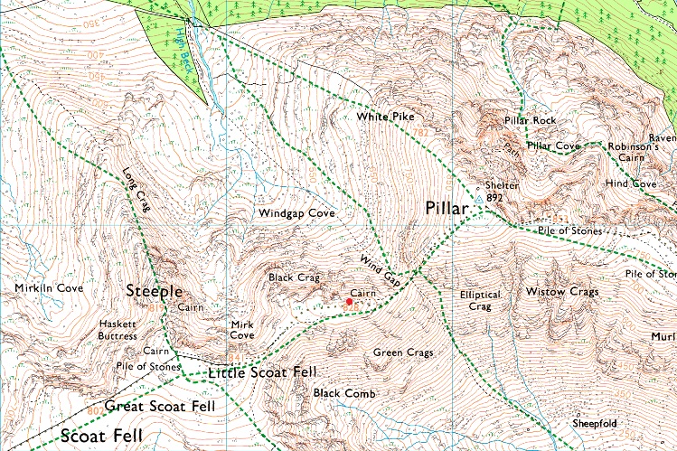 Harrow Head - Gill Beck - Buckbarrow - Glade How - Seatallan - Middle Fell - Winscale Hows - Pots of Ashness - Haycock - Scoat Fell - Steeple - Black Crag - Windy Gap - Pillar - Windy Gap - Black Crag - Red Pike - Dore Head - Stirrup Crag - Yewbarrow - Bell Rib - Overbeck Bridge |