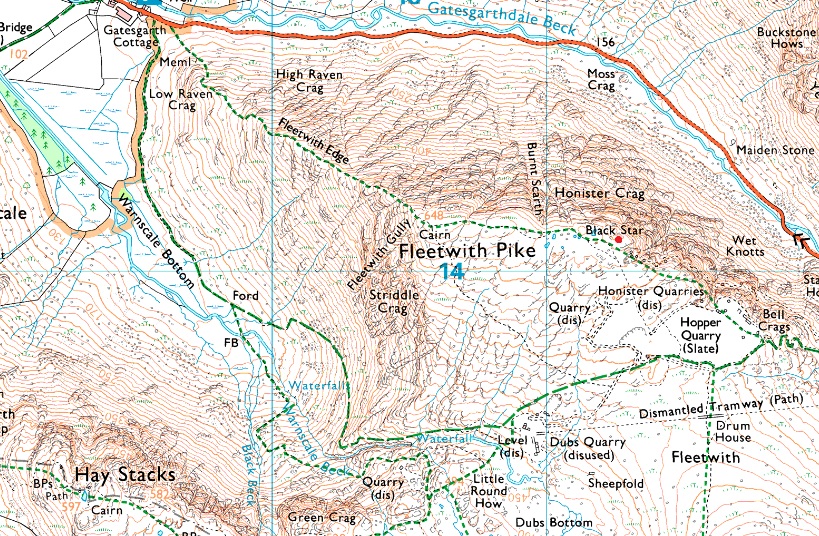 Gatescarth - Folders Wood Hassesshow Beck - Robinson - Littledale Edge - Hindscarth - Hindscarth Edge - Dale Head - Yewcrag Quarry Path - Honister Slate Mine - Honister Quarries - Black Star (Honister Crag) Fleetwith Pike - Fleetwith Edge - Gatescarth |