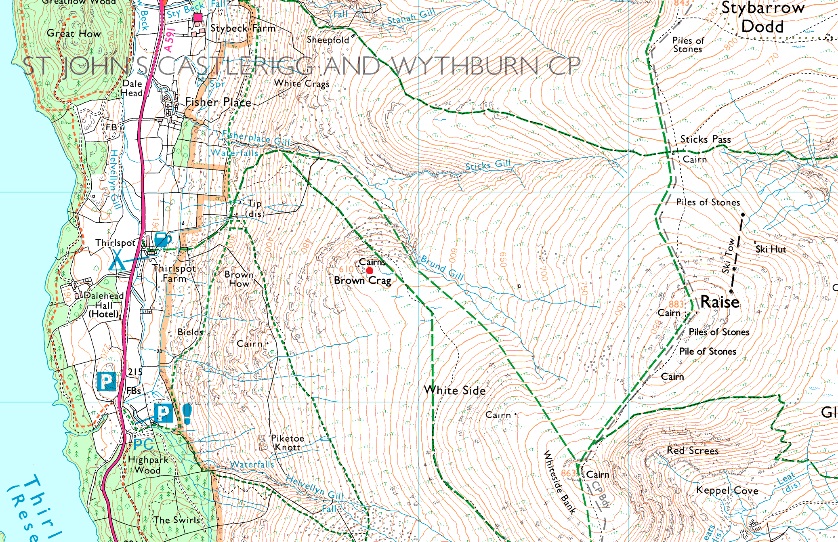 Wanthwaite - Wanthwaite Bank - Clough Head - Great Dodd - Watson's Dodd - Stybarrow Dodd - Sticks Pass – Raise – White Side – Brown Crag - Brund Gill – Fisherplace Falls - Fisher Place - A591 - Legburthwaite - Long Band - High Rigg - St John's-in-the-Vale Church - Yew Tree Farm - Wanthwaite Bridge - Wanthwaite |