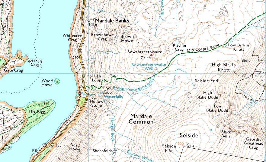 Rosgill Moor – Scalebarrow Tarn – Scalebarrow Knott – Harper Hills – Powley’s Hill – Hare Shaw – Old Corpse Road – Selside End – Selside Pike – Rowantreethwaite Cairn – Aaron’s Bield –High Naddle Forest – Wallow Crag – Hugh’s Laithes Pike – Naddle Beck – Naddle Farm – Scalebarrow Knott – Rosgill Moor |