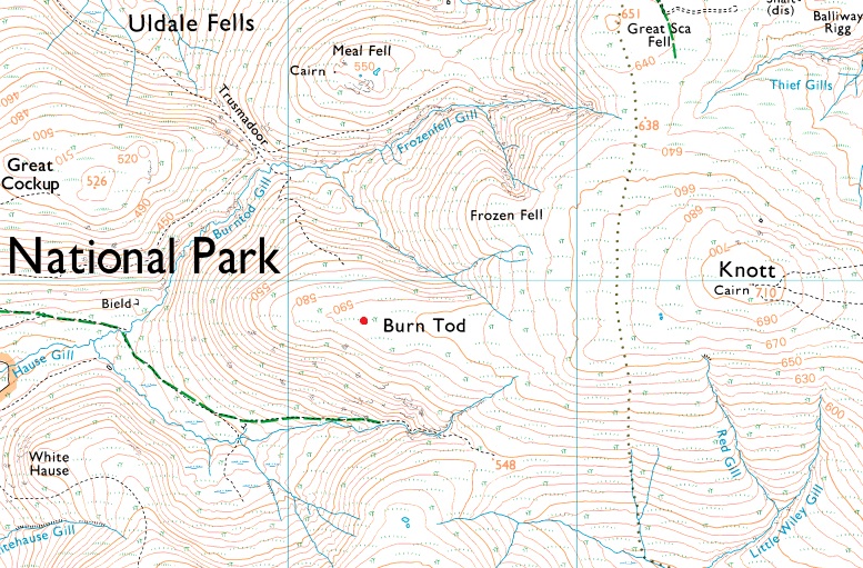 Peter House Farm - Horsemoor Hills - Orthwaite - Orthwaite Bank - Little Cockup - Great Cockup - Trusmadoor - Meal Fell - Little Sca Fell - Great Sca Fell - Knott - Frozen Fell - Burn Tod - Trusmadoor - Burntod Gill - Dash Valley - Horsemoor Hills - Orthwaite |