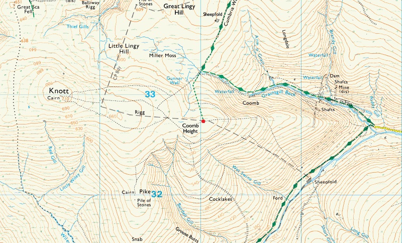 Mosedale - Carrock Fell Mine Road - Round Knott - Carrock Fell - Drygill Head - High Pike (Caldbeck) - Great Lingy Hill - Top of Roughton Gill - Great Sca Fell - Little Sca Fell - Great Sca Fell - Knott - Coomb Height - Top of Wiley Gill - Great Calva - River Caldew - Cumbrian Way - Carrock Fel Mine Road - Mosedale |