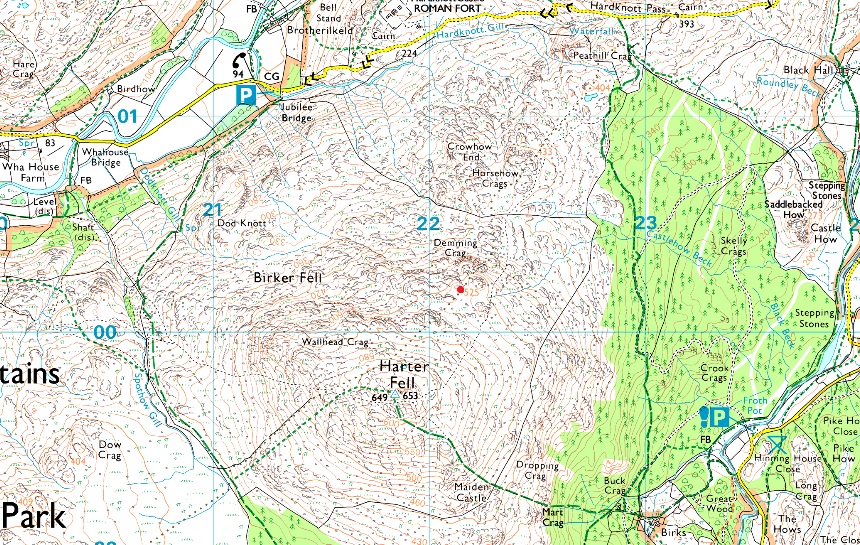 Jubilee Bridge - Dodknott Gill - Harter Fell (Eskdale) - Demming Crag - Horsehow Crags - Hardknott Pass - Border End - Hardknott Roman Fort - Jubilee Bridge |