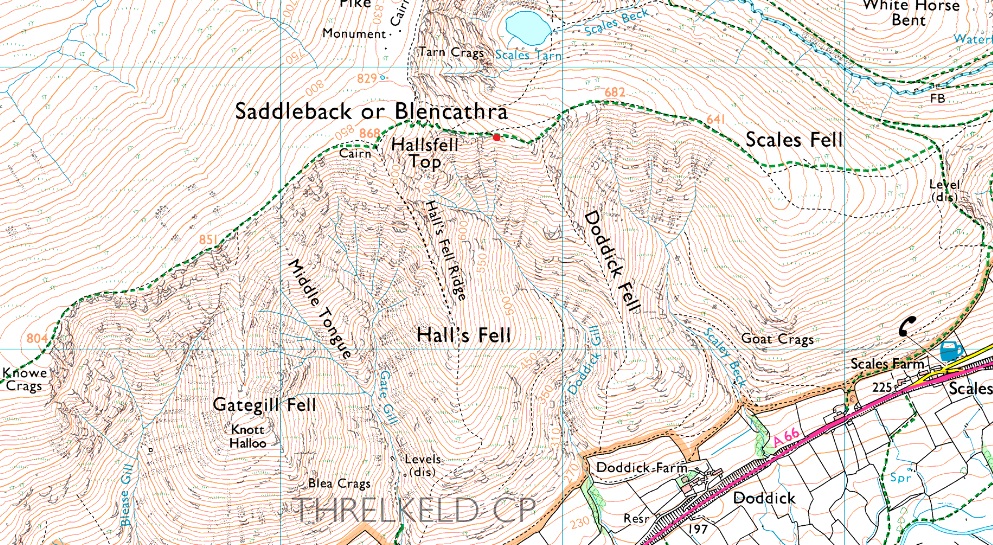 A66 - Scales Fell - Doddick Fell - Hall's Fell Top (Blencathra) - Gategill Fell Top - Blease Fell - Gate Gill - Doddick Gill - Scaley Beck - A66 |