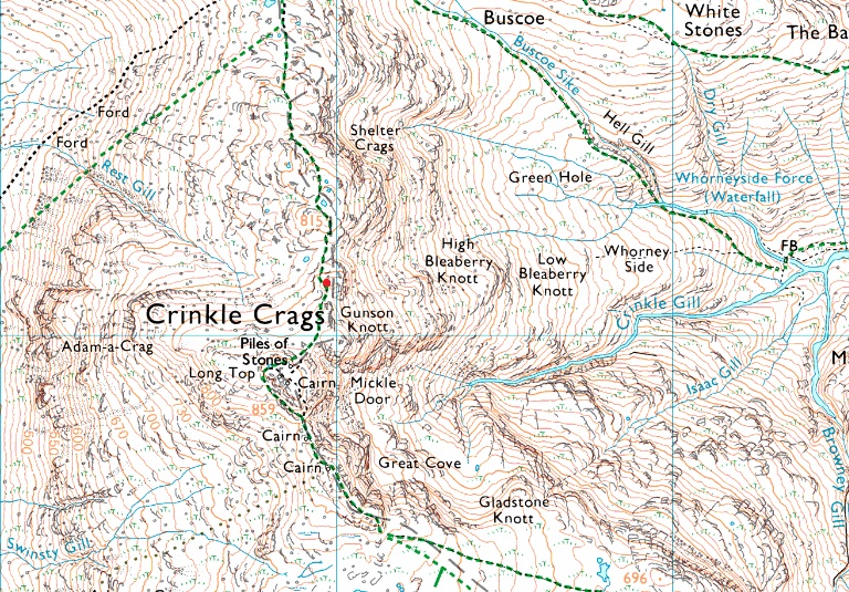 Old Dungeon Gill – Stool End Farm – Oxendale – Whorneyside Force – Hell Gill – Shelter Crags East Ridge Rake – Crinkle Crags – Great Knott – Cold Pike – Red Tarn – Pike O’Blisco – Wrynose Fell – Redacre Gill – Old Dungeon Gill |