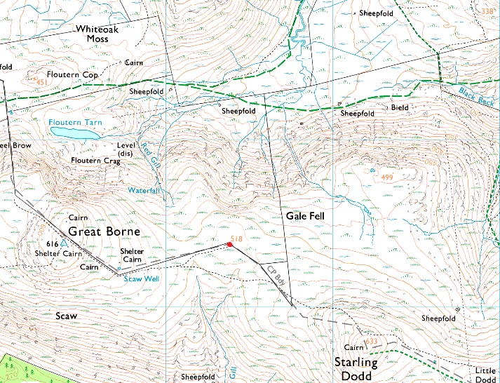 Top of Honister Pass - Honister Mines - Fleetwith Pike - Dubs Bottom - Blackbeck Tarn - Innominate Tarn - Hay Stacks - Top of Scarth Gap Pass - Seat - Gamlin End - High Crag - High Stile - Red Pike (Buttermere) - Little Dodd - Starling Dodd - Great Borne - Top of Red Gill - Whiteoak Moss - Scales Force - Buttermere Dubbs - The Fish Inn, Buttermere