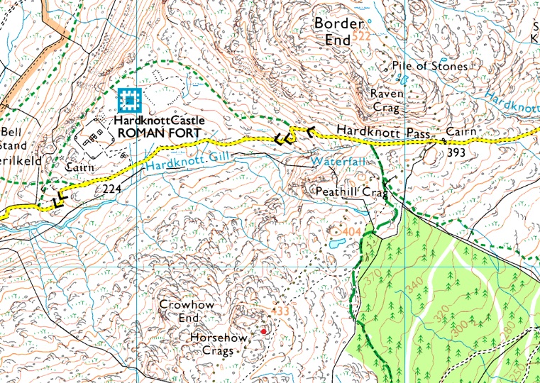 Jubilee Bridge - Dodknott Gill - Harter Fell (Eskdale) - Demming Crag - Horsehow Crags - Hardknott Pass - Border End - Hardknott Roman Fort - Jubilee Bridge |