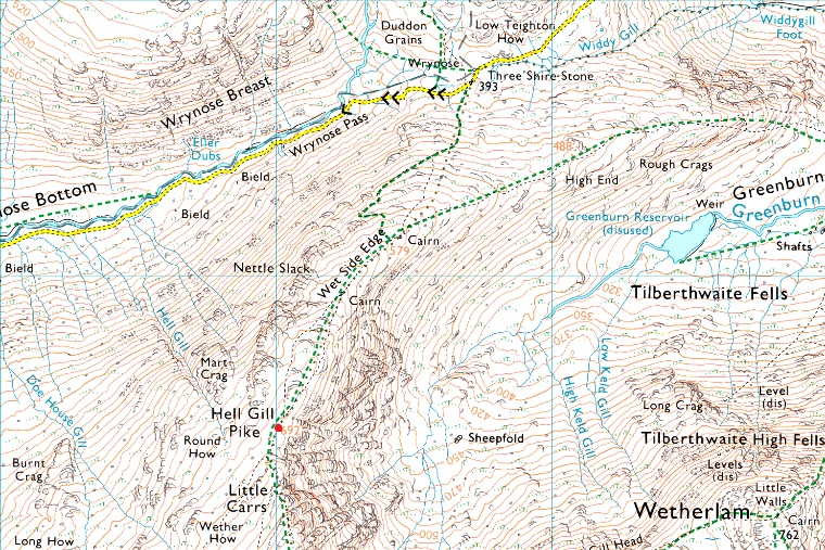Three Shire Stone - Wet Side Edge - Hell Gill Pike - Little Carrs - Great Carrs - Top of Broad Slack - Swirl How - Fairfield - Grey Friar - Fairfield - Wether How - Hell Gill Pike - Wet Side Edge - Three Shire Stone |