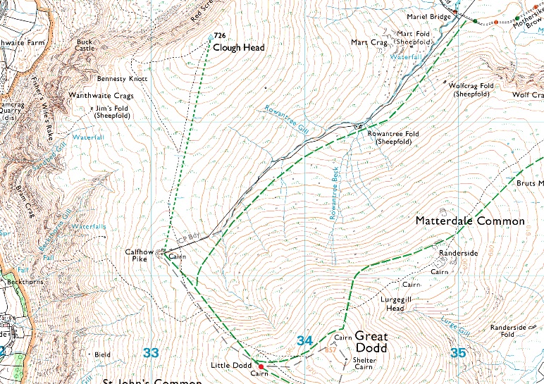 Wanthwaite - Old Coach Road - Wanthwaite Bank - Threlkeld Knotts - Clough Head - Calfhow Pike - Little Dodd - Great Dodd - Randerside - Matterdale Common - Wolf Crags - Old Coach Road |