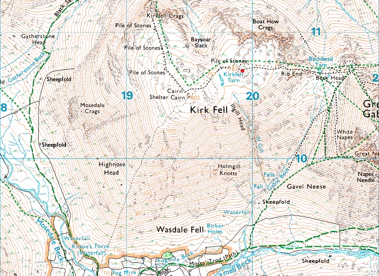 Wasdale Head - Mosedale - Gatherstone Beck - Gatherstone Head - Top of Black Sail Pass - Kirkfell Crags - Kirk Fell - Kirk Fell North Top - Rib End - Beck Head - Great Gable - Breast Route - Sty Head - Moses Trod - Burnthwaite - Wasdale Head