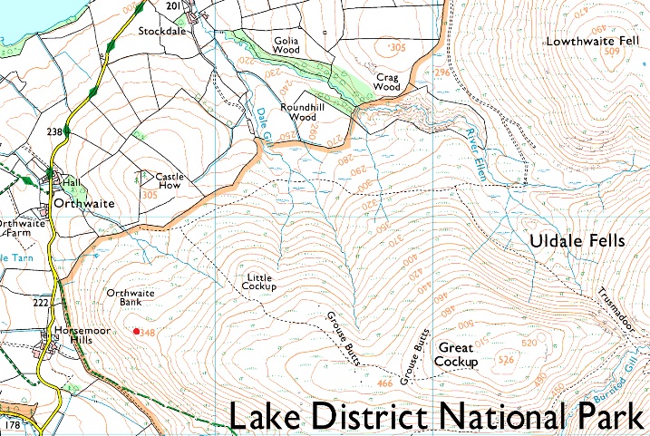 Peter House Farm - Horsemoor Hills - Orthwaite - Orthwaite Bank - Little Cockup - Great Cockup - Trusmadoor - Meal Fell - Little Sca Fell - Great Sca Fell - Knott - Frozen Fell - Burn Tod - Burntod - Trusmadoor - Burntod Gill - Dash Valley - Horsemoor Hills - Orthwaite |