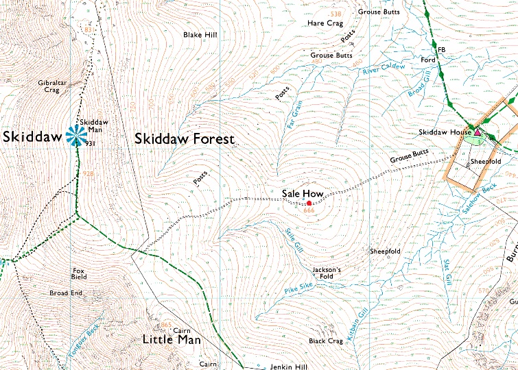 Underscar - Gale Road - Hawell Monument - Tourist Track - Skiddaw Lesser Man - Skiddaw Little Man - Skiddaw - Sale How - Skiddaw House - Cumbrian Way - Whit Beck - Hawell Monument - Gale Road - Underscar |