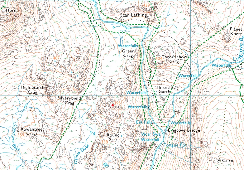 Top of Hard Knott Pass - Border End - Eskdale Needle - Hard Knott - Yew Bank - Lingcove Beck - Throstlehow Crag - Scar Lathing - River Esk - High Scarth - Silverybield - Damas Dubs - Scale Gill - Scale Bridge - Taw House - Brotherilkeld - Hard Knott Pass - Hardknott Fort - Top of Hard Knott Pass |