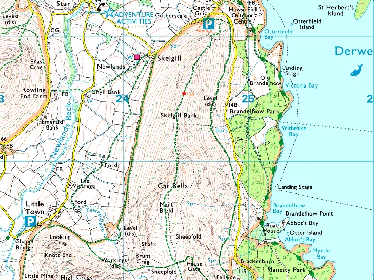 Gutherscale - Skelgill Bank - Cat Bells - Hause Gate - Maiden Moor - Narrow Moor - High Spy - Rigghead Quarry - River Derwent - Grange - Manesty - Catbells Terrace - Gutherscale |