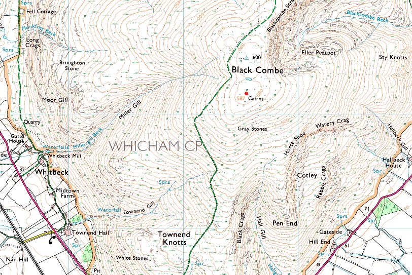 A595 - Townend Gill - Whitbeck - Millergill Beck - Black Combe - Black Combe South Top - Townend Knotts - Seaness - Throstlerake Crag - A595 |