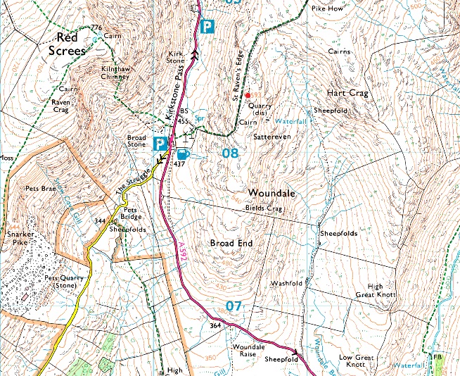 Cow Bridge – Brothers Water – Hartsop Hall – Middle Dodd – Smallthwaite Band – Red Screes – Kirkstone Pass – St Ravens Edge – John Bell’s Banner – Caudale Moor (Stony Cove Pike) – Hartsop Dodd – Hartsop – Cow Bridge |