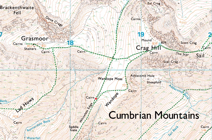 Cinderdale Common – Rannerdale – Squat Beck – Whiteless Breast – Whiteless Pike – Whiteless Edge – Thirdgill Head Man – Wandope – Wandope East Ridge – Track Above Sail Beck – Third Gill – Bleak Rigg – Low Bank – Rannerdale Knotts – Hause Point – Rannerdale – Cinderdale Common |
