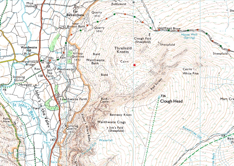 Wanthwaite - Old Coach Road - Wanthwaite Bank - Threlkeld Knotts - Clough Head - Calfhow Pike - Little Dodd - Great Dodd - Randerside - Matterdale Common - Wolf Crags - Old Coach Road |