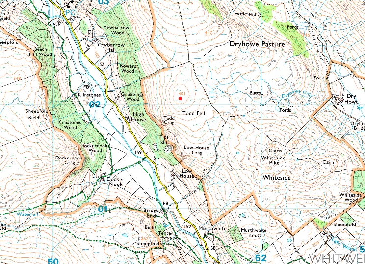 Dryhowe Bridge - Whiteside Pike - Todd Fell - Capplebarrow - Ancrow Brow - Borrowdale Moss - Long Crag (Bannisdale) - White Howe - Borrowdale Head - Lamb Pasture - Dryhowe Bridge |
