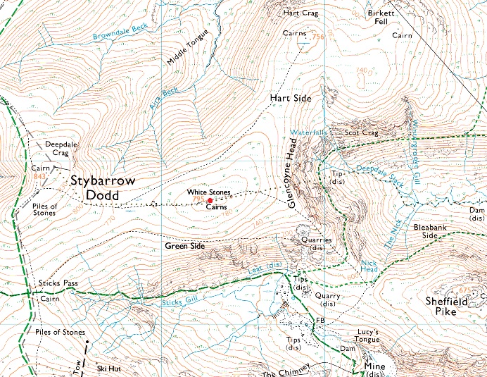 Glenridding - Greenside Road - Glenridding Dodd - Heron Pike - Sheffield Pike - Nick Head - Glencoyne Head - Hart Side - White Stones - Top of Sticks Pass - Raise - White Side - Keppel Cove Zigzags - Glenridding Beck - Greenside Road - Glenridding |