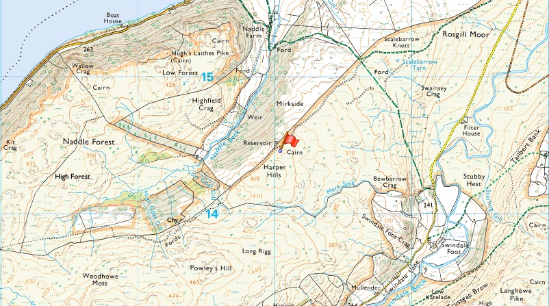 Rosgill Moor – Scalebarrow Tarn – Scalebarrow Knott – Harper Hills – Powley’s Hill – Hare Shaw – Old Corpse Road – Selside End – Selside Pike – Rowantreethwaite Cairn – Aaron’s Bield –High Naddle Forest – Wallow Crag – Hugh’s Laithes Pike – Naddle Beck – Naddle Farm – Scalebarrow Knott – Rosgill Moor |