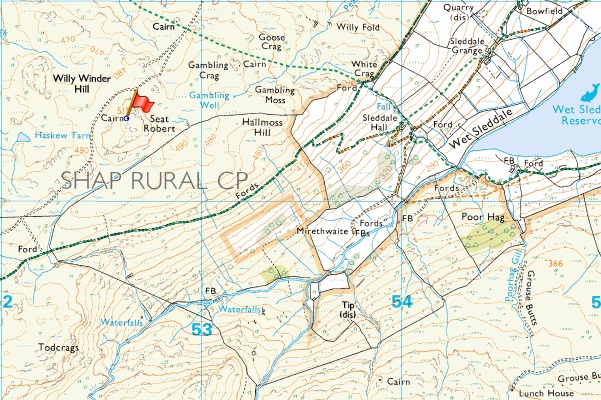 A6 Shap Road Summit - Whatshaw Common - Little Yarlside - Great Yarlside - Harrop Pike - Grey Crag - Greycrag Tarn - Tarn Crag - Mosedale Cottage - Mosedale Beck - Scam Matthew - High Wether Howe - Seat Robert - Sleddale Hall - Wet Sleddale Reservoir |