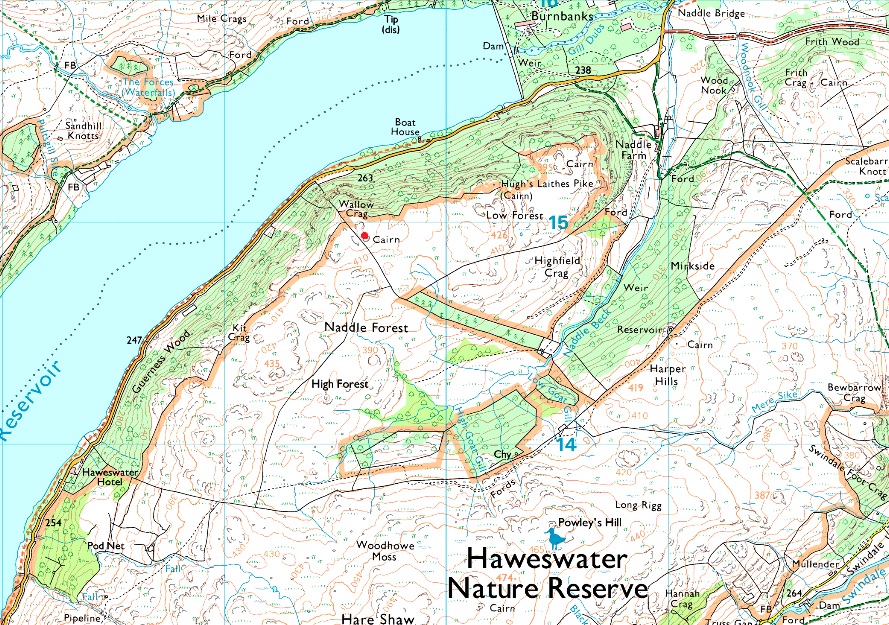 Rosgill Moor – Scalebarrow Tarn – Scalebarrow Knott – Harper Hills – Powley’s Hill – Hare Shaw – Old Corpse Road – Selside End – Selside Pike – Rowantreethwaite Cairn – Aaron’s Bield –High Naddle Forest – Wallow Crag – Hugh’s Laithes Pike – Naddle Beck – Naddle Farm – Scalebarrow Knott – Rosgill Moor |