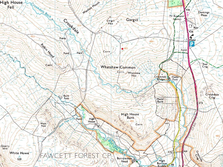 Hause Foot – Crookdale Bridge – High House Bank – Robin Hood – Lord’s Seat – Buck Crags – Harrop Pike – Great Yarlside – Wasdale Pike – Little Yarlside – Wasdale Mouth – Whatshaw Common – Crookdale Beck – Crookdale Bridge |