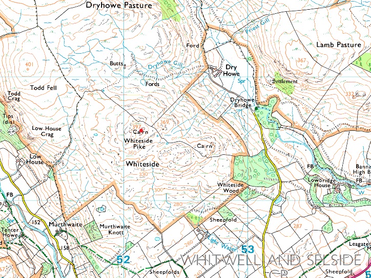 Dryhowe Bridge - Whiteside Pike - Todd Fell - Capplebarrow - Ancrow Brow - Borrowdale Moss - Long Crag (Bannisdale) - White Howe - Borrowdale Head - Lamb Pasture - Dryhowe Bridge |