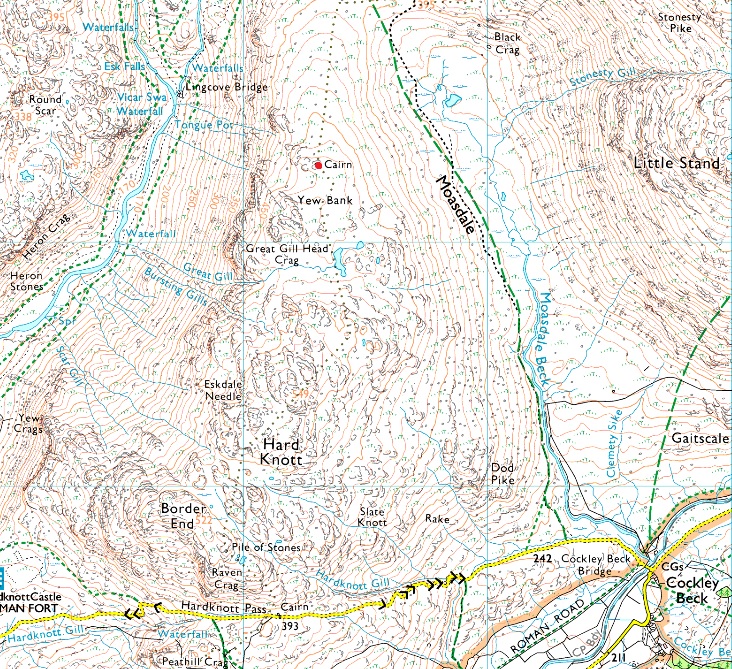Jubilee Bridge - Hardknott Pass - Hardknott Roman Fort - Border End - Eskdale Needle - Hard Knott - Yew Bank - Lingcove Beck - Scar Lathing - Lingcove Bridge - Brotherilkeld - Jubilee Bridge |