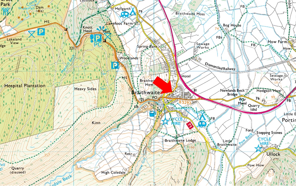 Braithwaite - Braithwaite Lodge - Barrow - Barrow Door - Low Moss - Outerside - High Moss - Stonycroft Gill - Newlands Pass - Stair - Uzzicar - Braithwaite |
