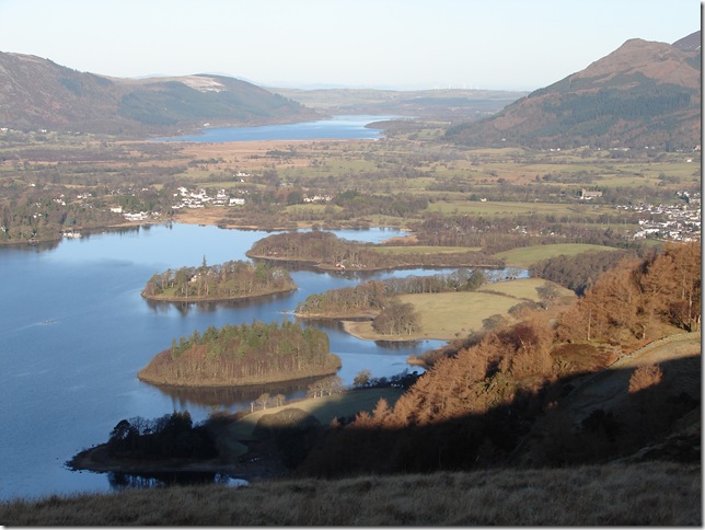 Dewent Water & its Islands, with Bassenthwaite Lake in the background . |