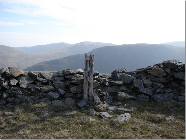 The true summit of Hartsop Dodd marked by this wooden post. |