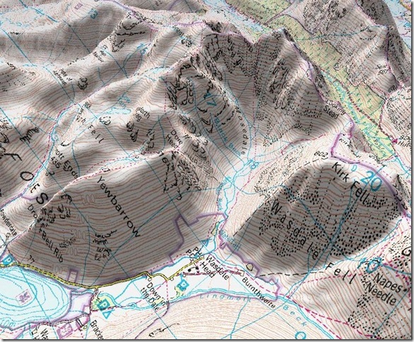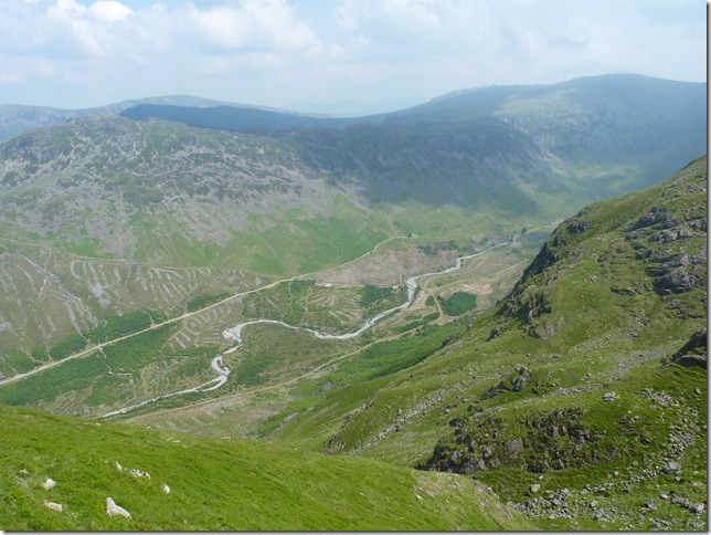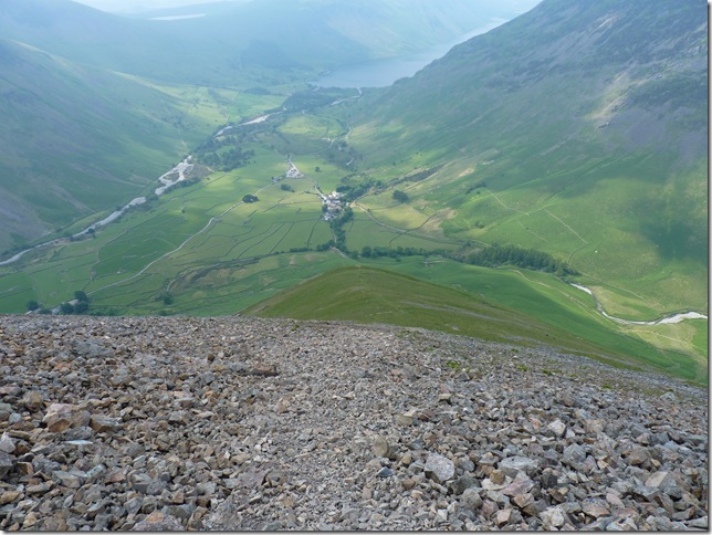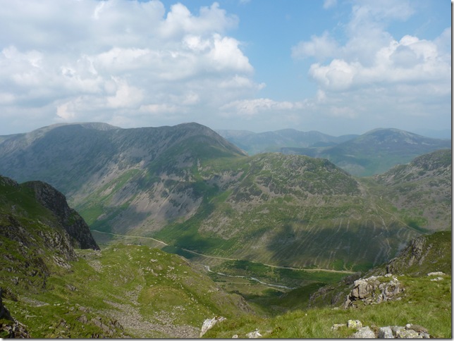 One of many descents on today’s walk, here from Kirk Fell Crags & heading for Black Sail Pass. the horizontal path leading from Ennerdale into Mosedale, our route however is straight ahead. |