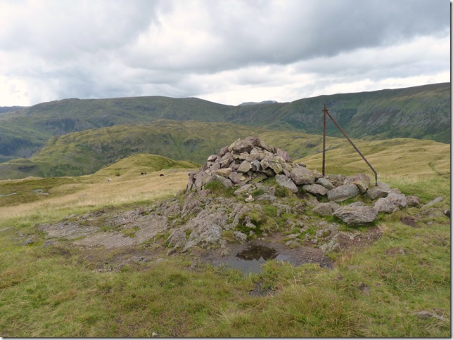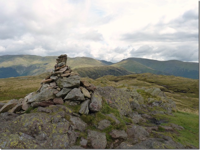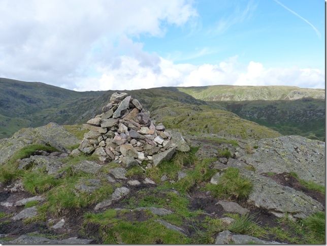 Calf Crag summit cairn with the Steel Fell ridge in the background. |