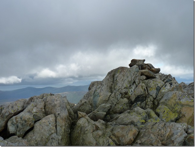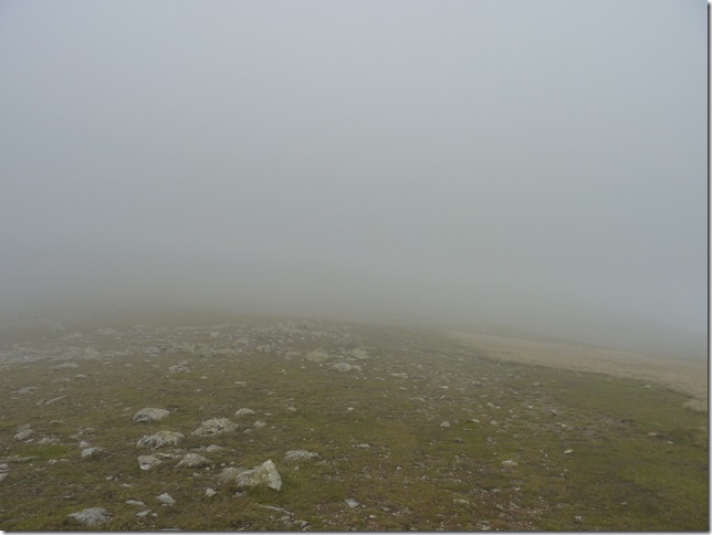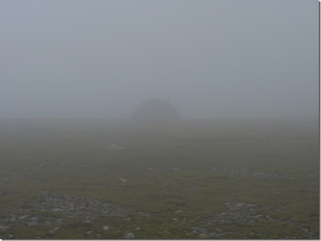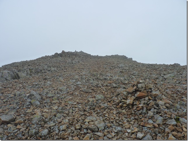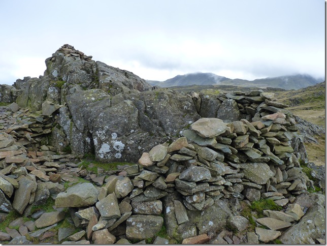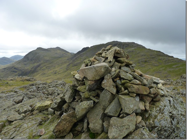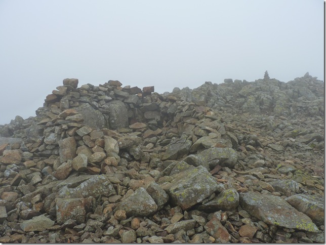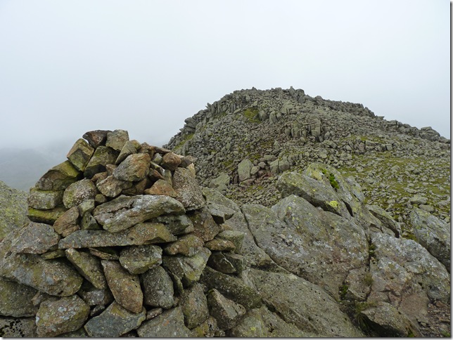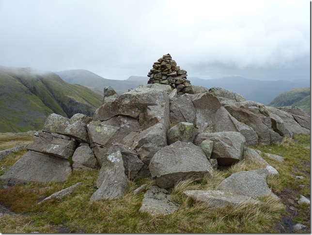 Sadly again I’ve lost the views,. Great End summit shelter & cairn. |