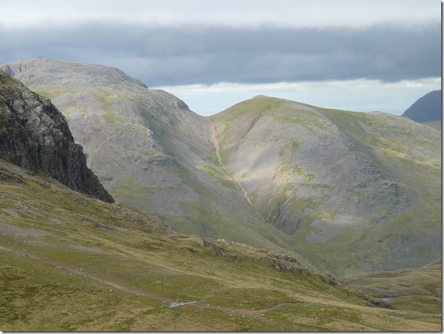 Seathwaite Fell to the right with Green Gable & Great Gable just under cloud to the left. |