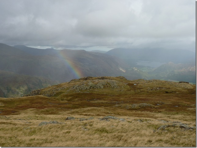 On the main ridge towards the summit, here looking back towards Dewent Water & a lucky glimpse of a rainbow. |