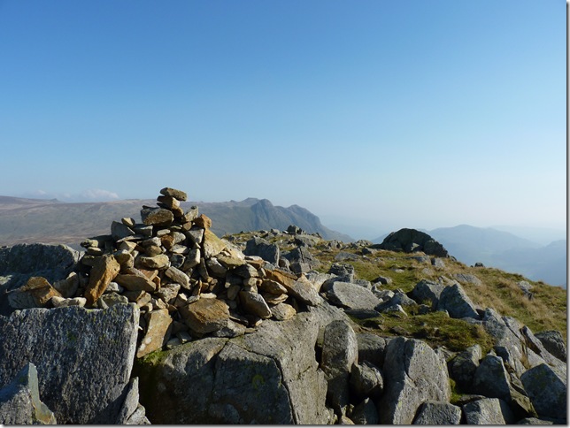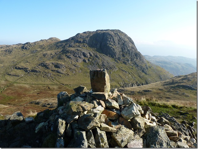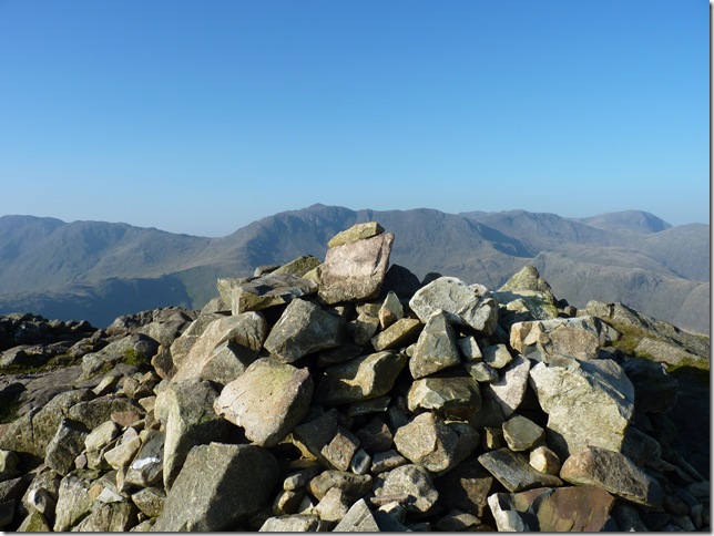 Pike O’Stickle Summit cairn with a host of Fells LtoR Bow Fell, Esk Pike, Rossett Pike (my final fell) Allen Crags & Great End. |