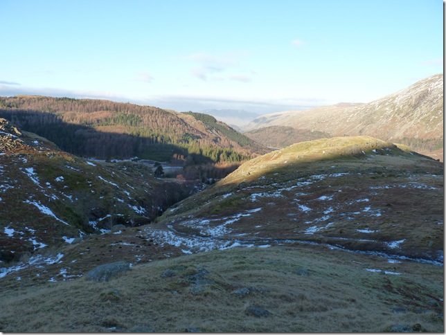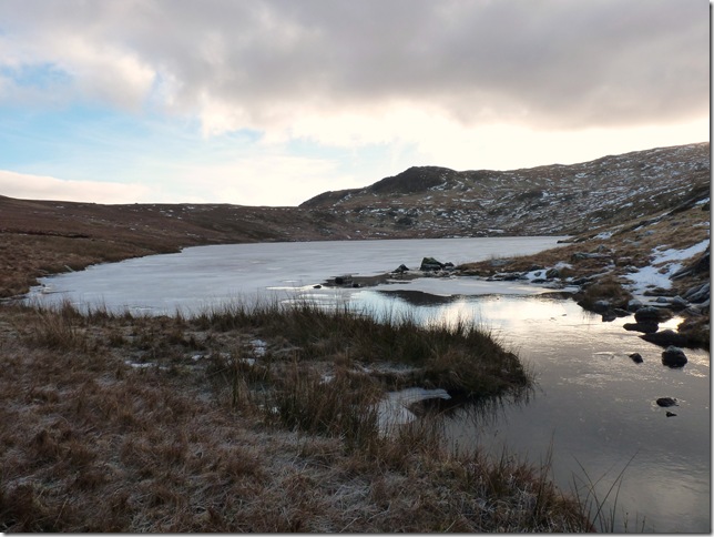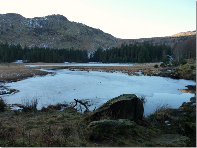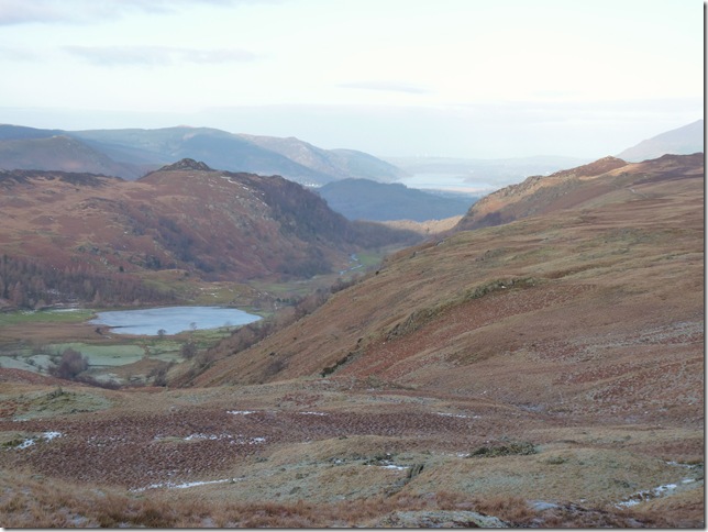 Views down towards a frozen Harrop Tarn, my path veers around the Crag to the right. |