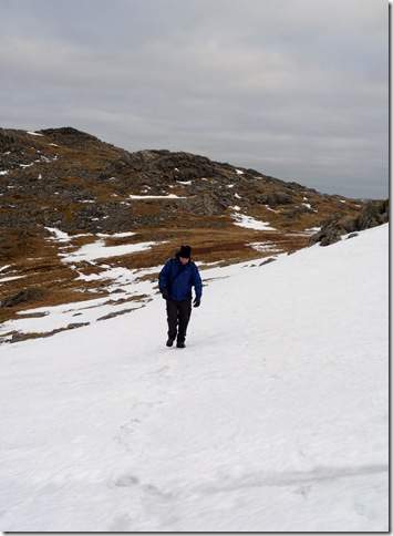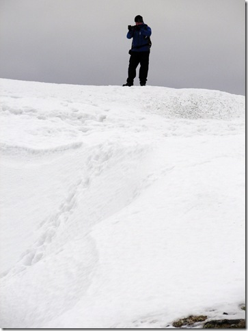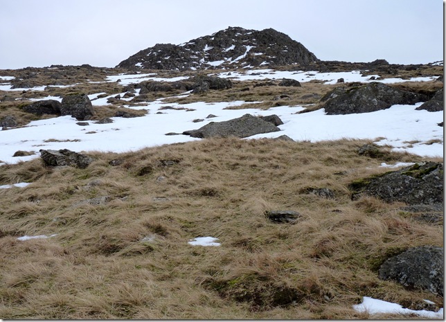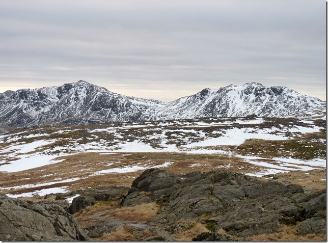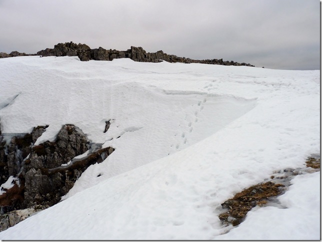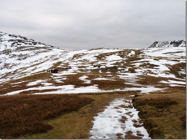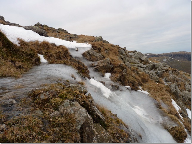 We concentrated on the descent off Great End & back to Esk Hause where the path became patchy icy underfoot, out of shot here was a small gully to negotiate, the snow on one side had become compact as walkers had used there boots to form kick holes, with only three kick holes I thought I’d place my left hand on top of the ice & swing my right hand side body up & back onto the path (as you would over a fence) I made this small leap however my camera didn’t & plunged along the top of this snow pack & landed ever so precariously avoiding the deep pool onto some rocks, I lunged after the camera thinking that’s it, its dead but all it needed was a wipe down & probably a more careful owner! |
