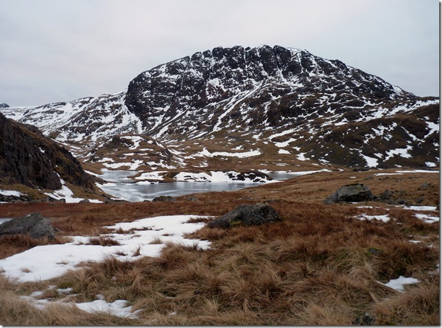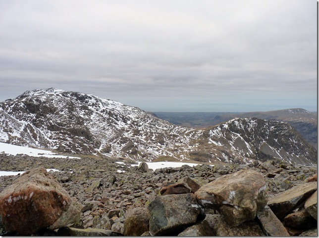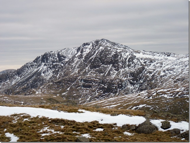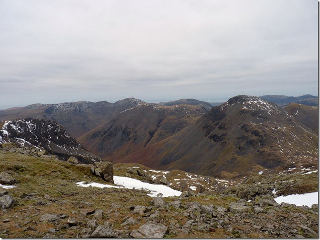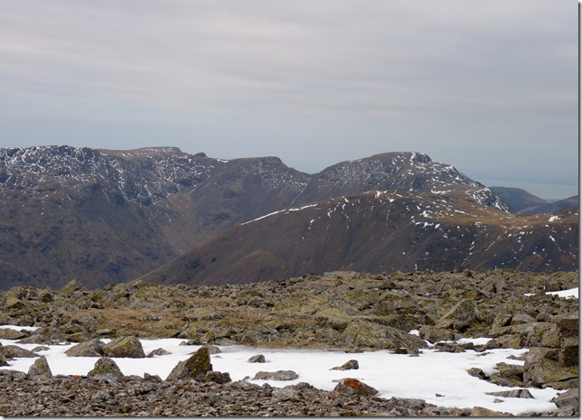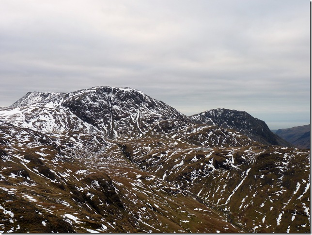 Great End taking centre this time with III Crag to the left & Lingmell to the right, if you look carefully you can just make out a frozen Sprinkling Tarn. |