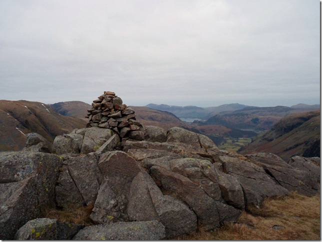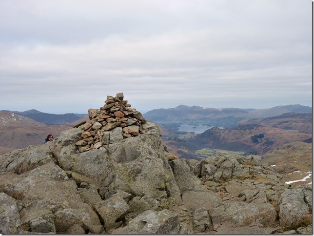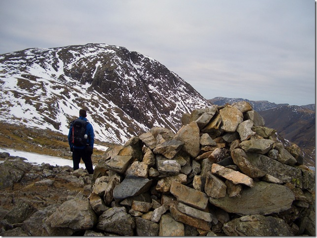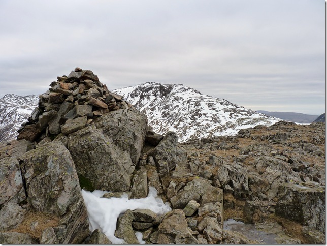 Allan Crags summit cairn with Esk Pike in the background, by now a slight chill in the wind meant hats & gloves were donned. |